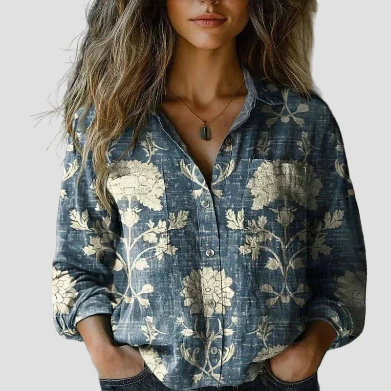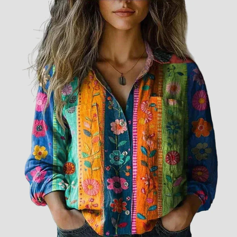Ez a blúz bonyolult mintázatú felsőrésszel és sima alsórésszel rendelkezik. ami kiegyensúlyozott. szemet gyönyörködtető megjelenést kölcsönöz neki. A gombos elülső rész és a klasszikus gallér elegáns megjelenést kölcsönöznek. miközben a blúz mindennapi viseletre is alkalmas. Ideális kirándulásokhoz. alkalmi találkozókhoz. vagy ha művészi részletekkel szeretnéd gazdagítani a ruhatáradat.