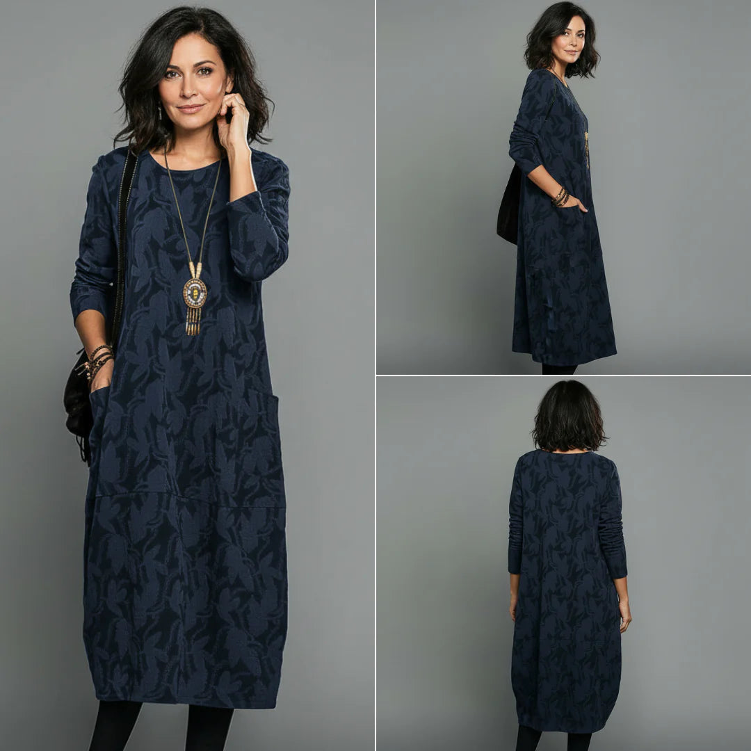 Fedezze fel az időtálló stílust ezzel az elegáns. laza szabású midi ruhával. amely laza sziluettel és finom textúrájú mintával rendelkezik. Ideális mindennapi viselethez. üzleti megbeszélésekhez vagy egy könnyed esti programhoz.