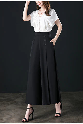 Ötvözze az időtlen eleganciát ezzel a stílusos. laza nadrággal. amely széles szárú sziluettel és kifinomult gombos részletekkel rendelkezik. Tökéletes választás az irodába. esti programokra vagy lazább alkalmakra. kecses mozgást és modern magabiztosságot kölcsönöz megjelenésének.